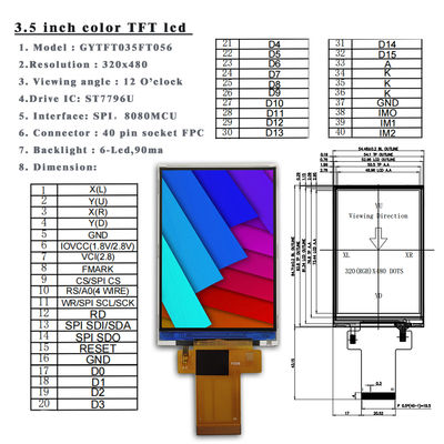 320X480 St7796U 40 Pins Socket Fpc Spi 8080Mcu 3.5 Inch Lcd Tft 3.5 Inch Tft Lcd